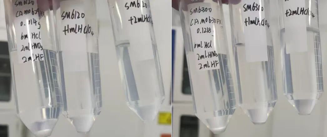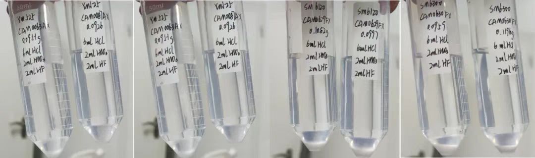 將消解結(jié)果告知客戶,客戶說明樣品YM525(CAM0087AX)和樣品YM525(CAM0063AX)屬于天然云母,樣品SM6120(CAM0629FX)和樣品SM6300(CAM0630FX)屬于合成云母,合成云母的消解溶液底部沉淀太多,希望可以將沉淀徹底消解完全。