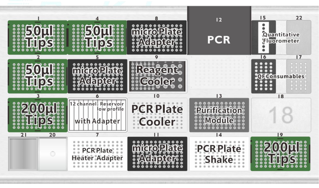 包含12/20個標準盤位,整合PCR板加熱、PCR板制冷、PCR板磁吸附、PCR板振蕩、PCR儀、試劑制冷、定量等各種功能模塊,靈活適用于低/中通量建庫需求,全自動化完成各類文庫構建流程,實現標準化操作。