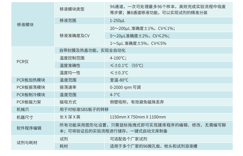 Vitae 180 NGS-96建庫儀適用于高通量(96個樣本/run)的建庫需求,可自動化完成各類文庫構建流程;包含建庫所需要的所有功能模塊(PCR板冷槽、PCR 板加熱模塊、PCR 板振蕩模塊、PCR板磁力架、PCR儀),滿足不同建庫流程的需要。