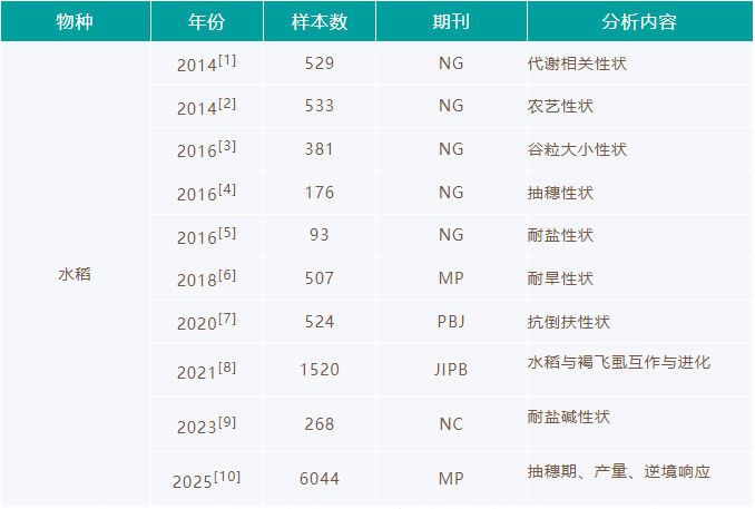 GWAS研究中,一般自然群體材料的樣本數量要求至少200個以上,而針對復雜性狀,樣本數量的要求更多,以便得到更為準確的功能基因定位(表1:水稻GWAS已發表文章中的樣本數量)。