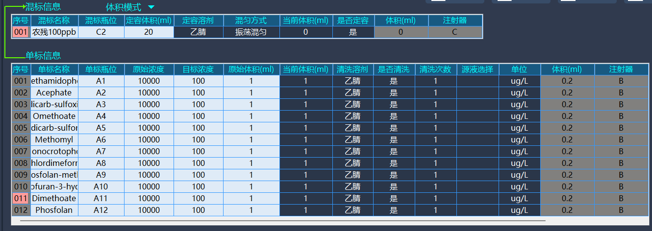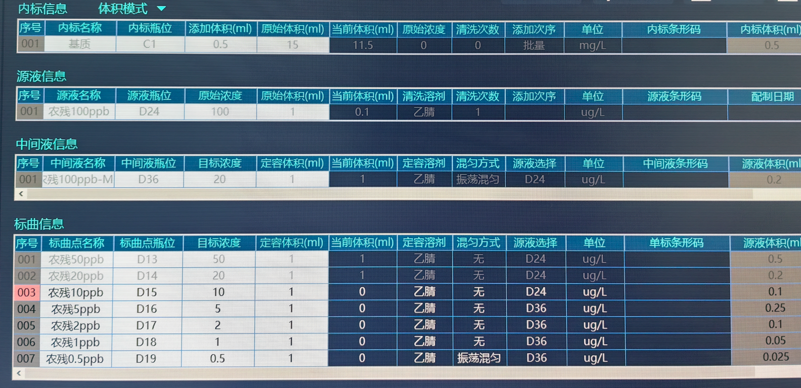 2.2 取100ppb農殘混標,配置成0.5、1、2、5、10、20、50的農殘標曲,每個標曲點同步添加0.5mL的基質(裝在20ml試劑瓶中,放置于C1位);
