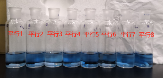 選擇GSB 07-3163-2014 200748水質 總硬度質控樣進行測試。質控樣真值為2.81±0.08mmol/L (2.73-2.89)。測定結果及滴定最終顏色見下圖。