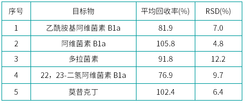 為了驗證該方法的回收率,本實驗于雞蛋樣品中加入5種阿維菌素類藥物混合標準品進行加標回收驗證(上機濃度5 μg/kg,n=6),數據如表-1所示。加標平均回收率在76.9%~105.8%之間,RSD值控制在15%以內,說明該方案能夠較好地運用于雞蛋中阿維菌素類藥物殘留量的檢測。
