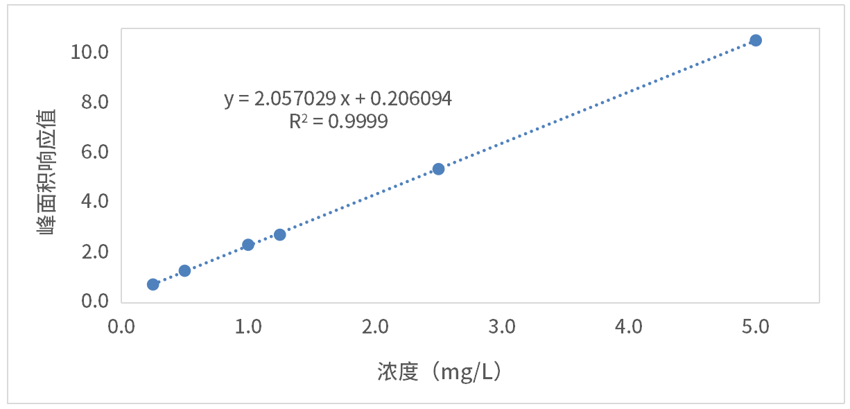 選擇硝酸鹽的儀器方法,建立序列,讓儀器自動稀釋一條標曲(稀釋倍數為1代表原液不稀釋),亞硝酸鹽母液為5.0mg/L,稀釋6個點,標曲點稀釋倍數分別為20、10、5、4、2、1,濃度為:0.25mg/L、0.50mg/L、1.0mg/L、1.25mg/L、2.5mg/L、5.0mg/L。