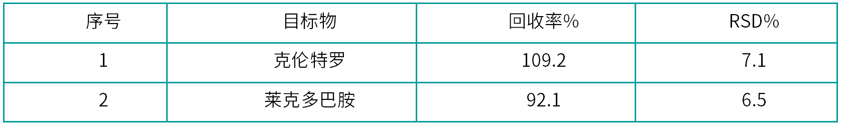 本次實(shí)驗(yàn)于兔肉中加入2種獸藥標(biāo)準(zhǔn)品混標(biāo)標(biāo)準(zhǔn)物質(zhì)進(jìn)行加標(biāo)回收驗(yàn)證(添加含量為0.1ug/kg,n=6),檢測(cè)結(jié)果如表-2所示,加標(biāo)回收在92.1-109.2%之間,RSD在10%以內(nèi),說名該方案可以運(yùn)用于兔肉中克倫特羅和萊克多巴胺的檢測(cè)。