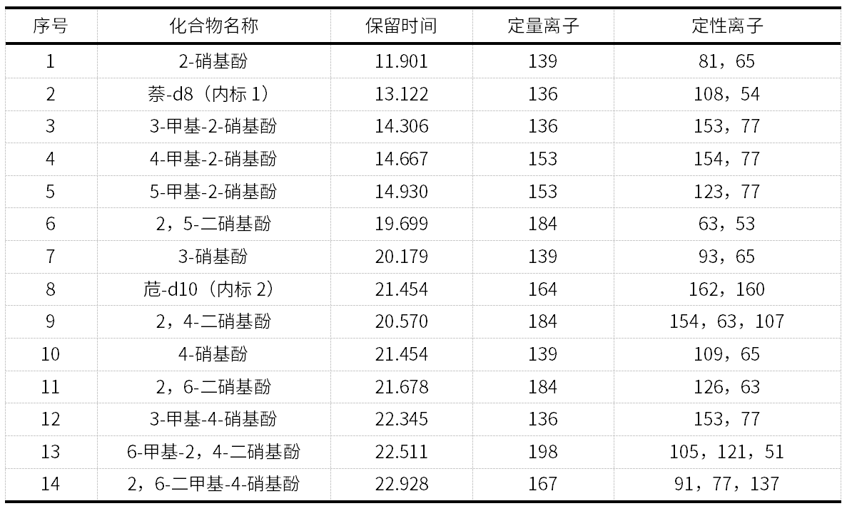 4. 由于硝基酚類化合物極性較大,在氣相色譜/質譜上的響應不是很靈敏,且分析靈敏度對儀器分析體系受污染狀況較為敏感。因此在上機分析時建議使用不填玻璃棉的襯管,否則2,4-二硝基酚、2,5-二硝基酚和2,6-二硝基酚這三個化合物極有可能不出峰。